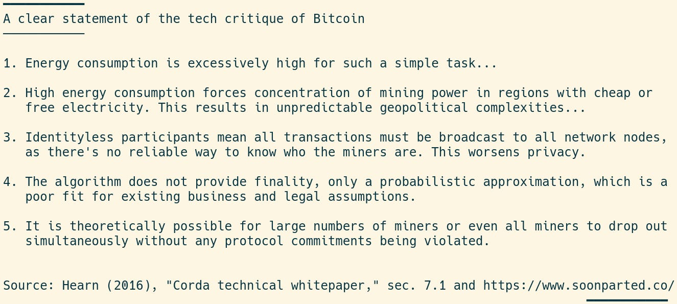 Corda offers a readable technical whitepaper by Mike Hearn, lead engineer for the Corda project until early 2021. Before that, Hearn was an early Bitcoin developer, and corresponded as early as 2009 with Bitcoin’s pseudonymous creator Satoshi Nakamoto. I mention this pedigree because Hearn’s Corda paper offers a clear and concise critique of Bitcoin, on crypto’s own terms—from one software engineer to another. I have reproduced it, slightly condensed: