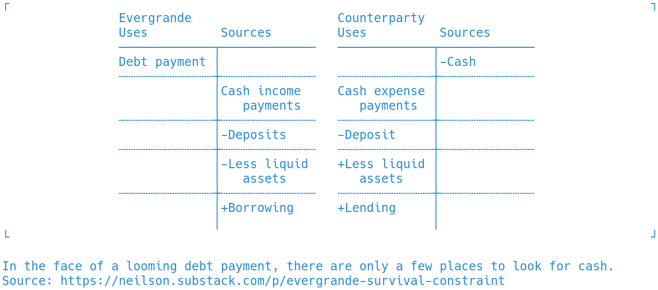 The survival constraint says that if a promised payment is not made, the firm will face its consequences in the legal system, up to and including the company's survival. Evergrande, like anyone who faces a looming payment, has little choice but to look for sources of cash. A big company might look in many places in its operations for spare change, but at a high level there are really only a few possibilities, as these T accounts show (in a sources and uses framework):
