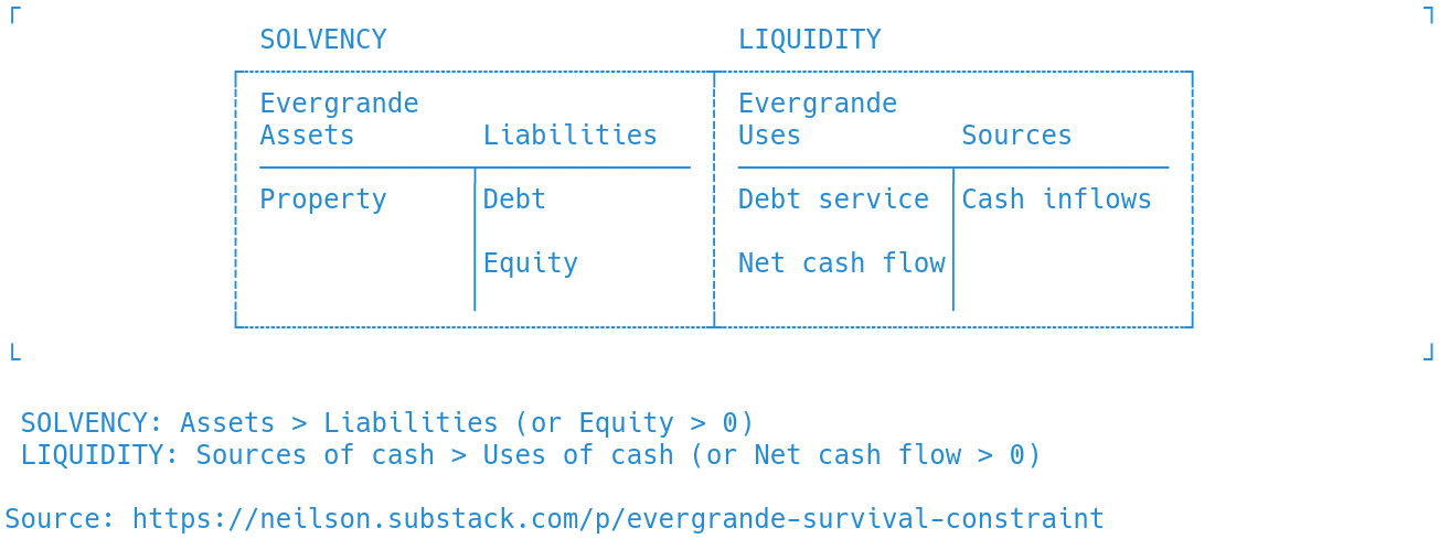 As Evergrande is demonstrating, it is one thing to take on a lot of debt, and another thing entirely to miss a payment. Too much debt, or more concretely liabilities in excess of assets, is called insolvency. Missing a payment, or more concretely cash commitments in excess of cash inflows, is called illiquidity. This can be illustrated in accounting terms, with the solvency view on the left using assets and liabilities, the liquidity view on the right using sources and uses: