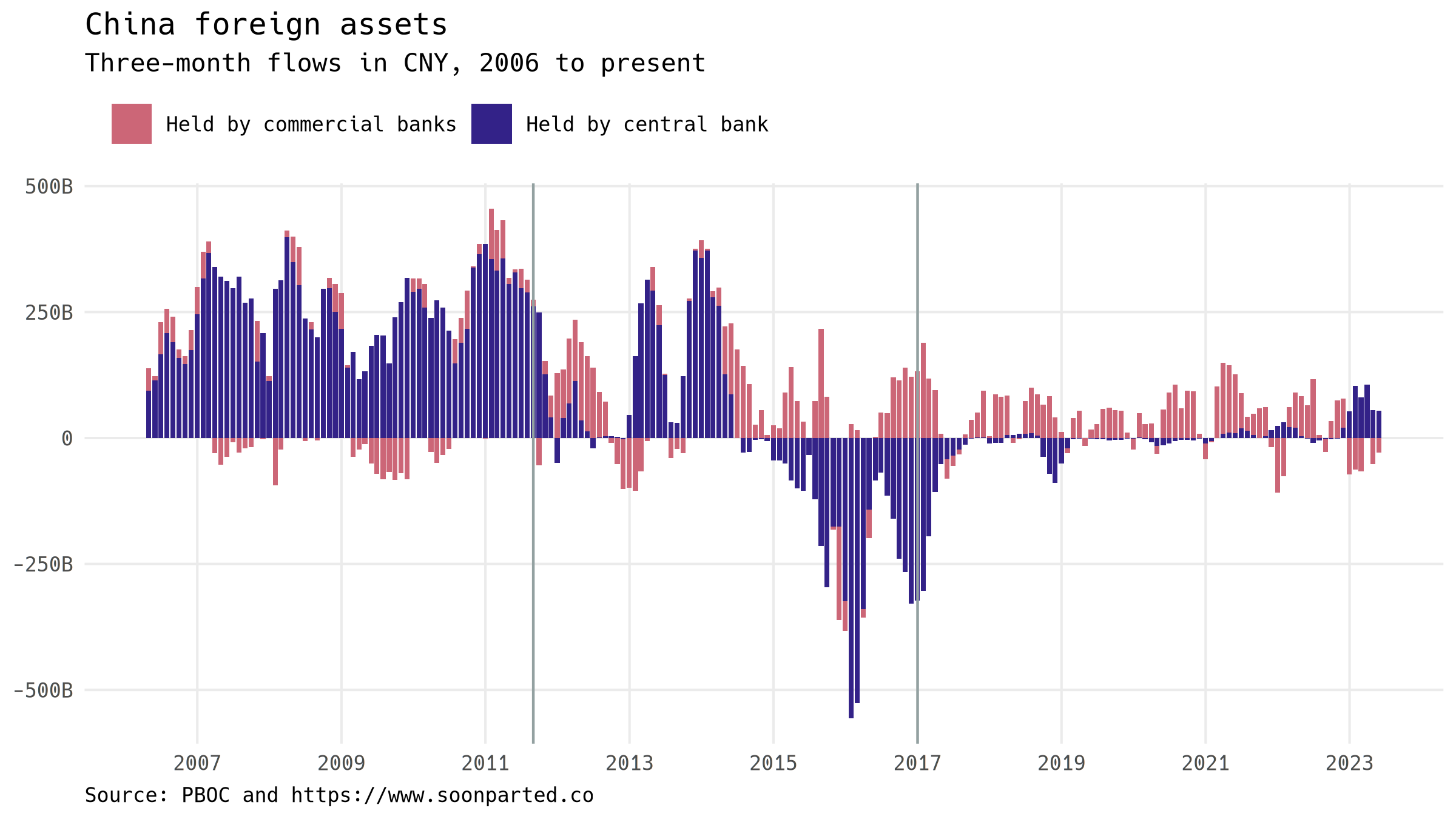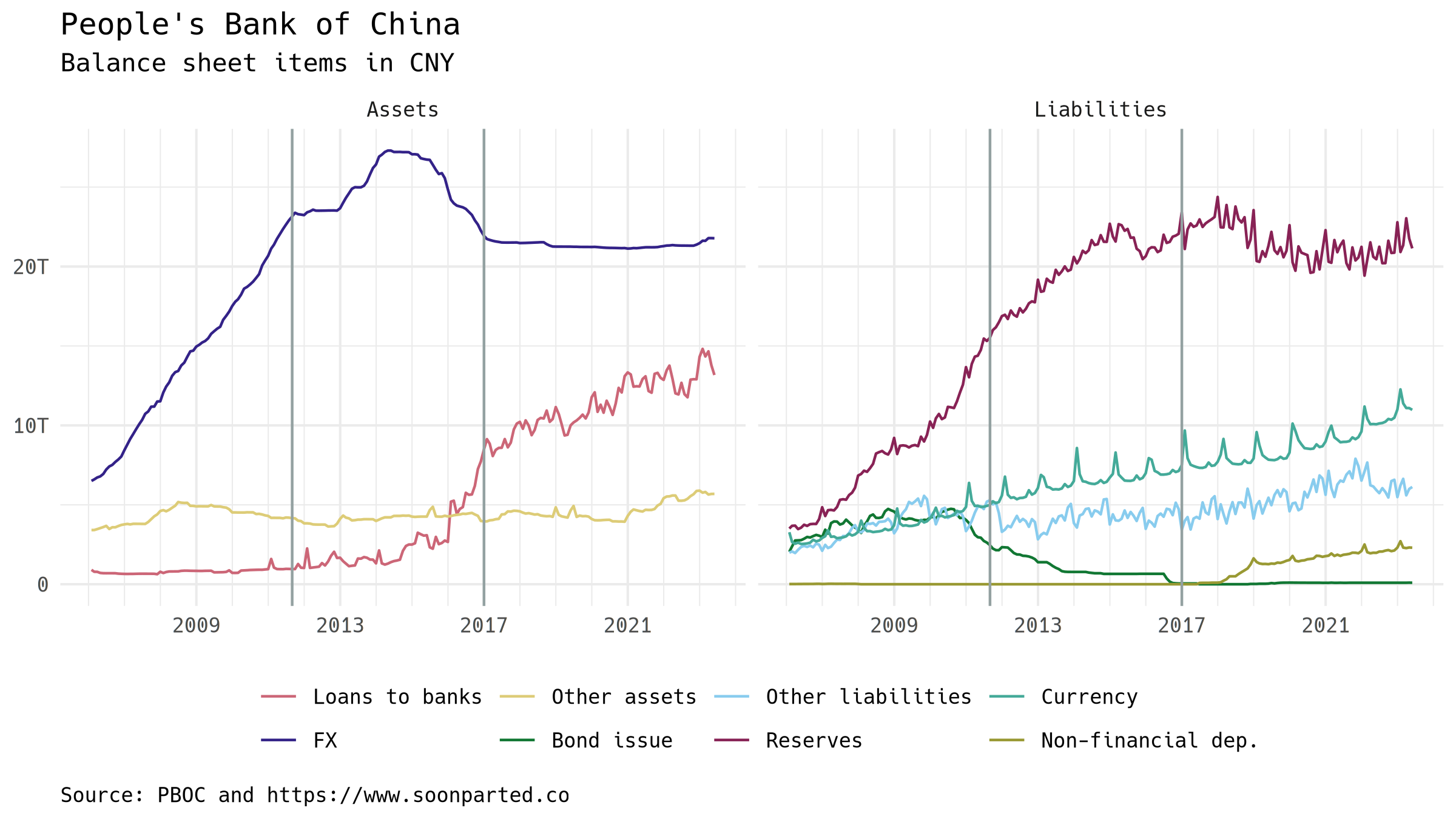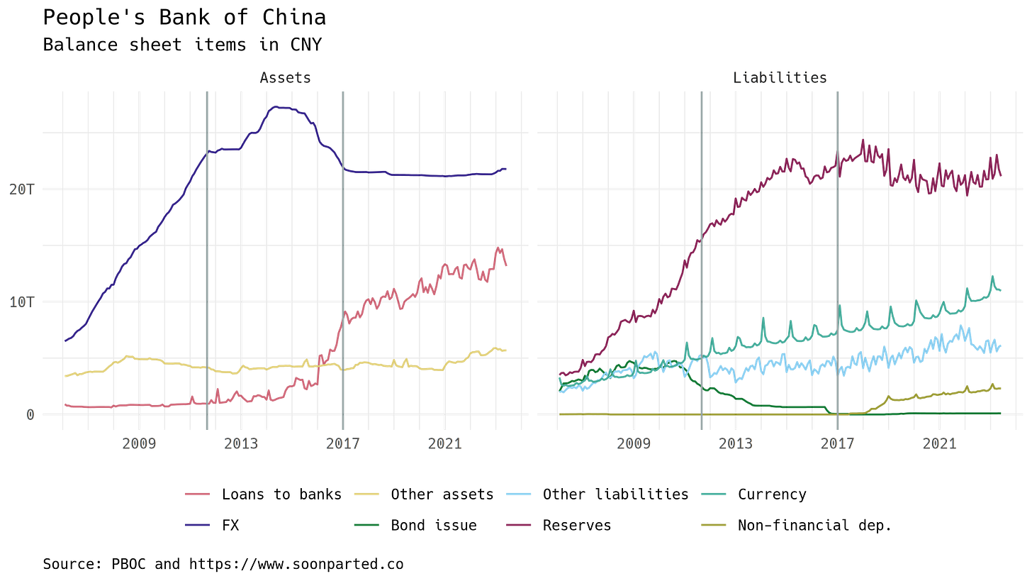 It is notable, then, that in the first half of 2023 the PBOC has been once again buying foreign assets. This graph shows the main components of China’s central bank’s balance sheet: