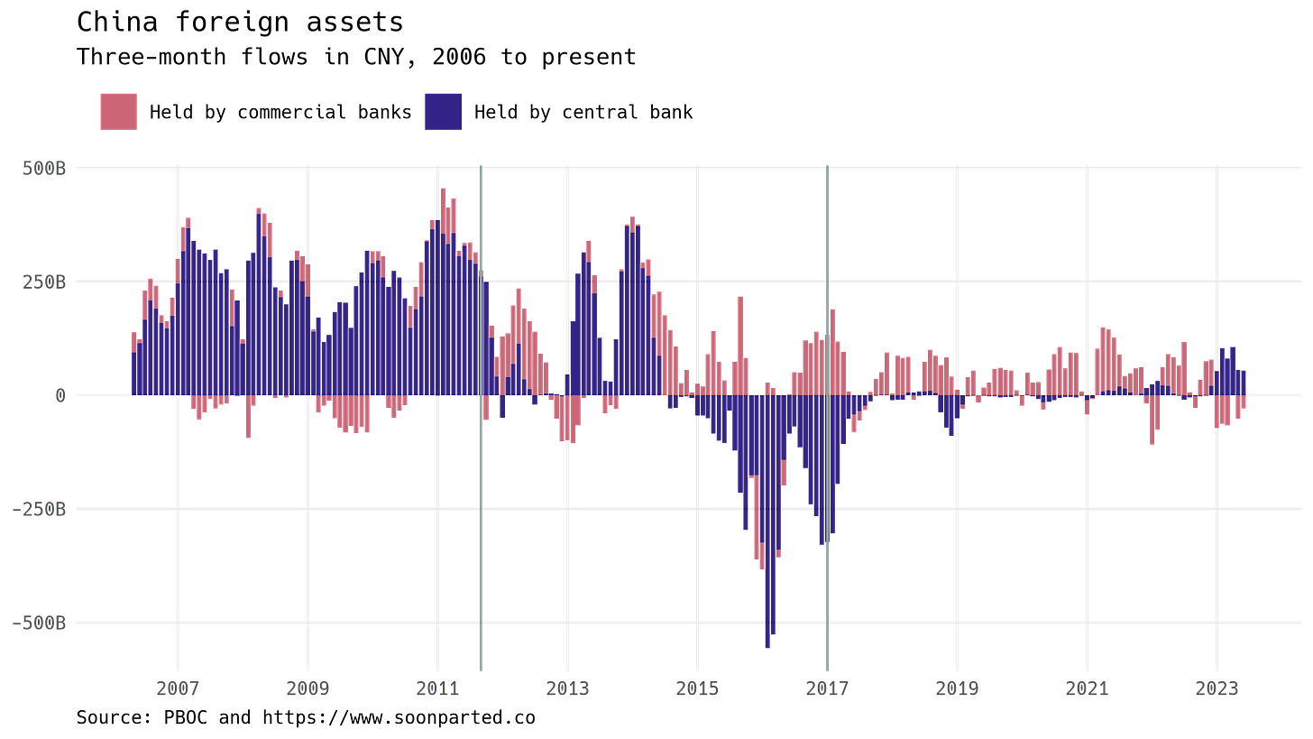 There are many interesting facts about China’s foreign exchange reserves, and some of them are even true. It is a fact that the People’s Bank of China rapidly expanded its portfolio of foreign assets up to about 2011. The PBOC then changed FX regimes, and since 2017 the level of reserves reported on its balance sheet has been very nearly constant.