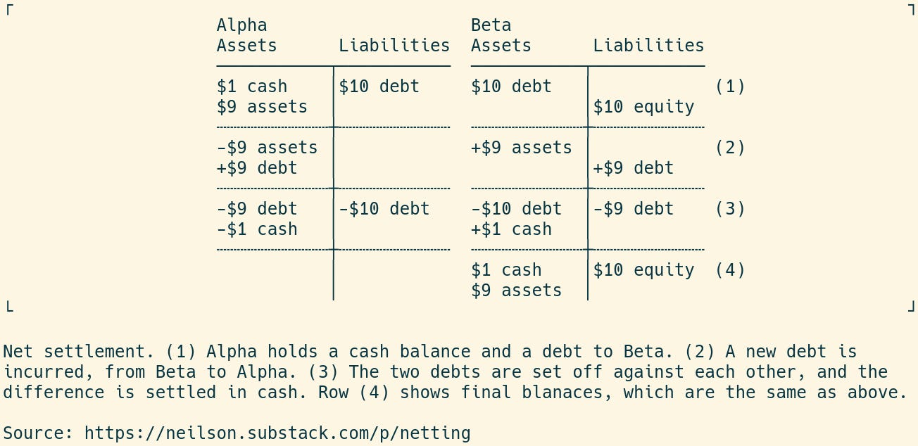 A correspondent wrote this piece, which brought my attention to transaction netting. Netting—aggregating offsetting transactions—is always in the background in my Money View of the financial system: it was present in a recent discussion about whether CBDCs might not flatten the monetary hierarchy; it also showed up in some of Izabella Kaminska's work on real time gross settlement. As my correspondent shows, the question of netting also clarifies certain crypto debates. All this prompts me to put netting into the foreground.