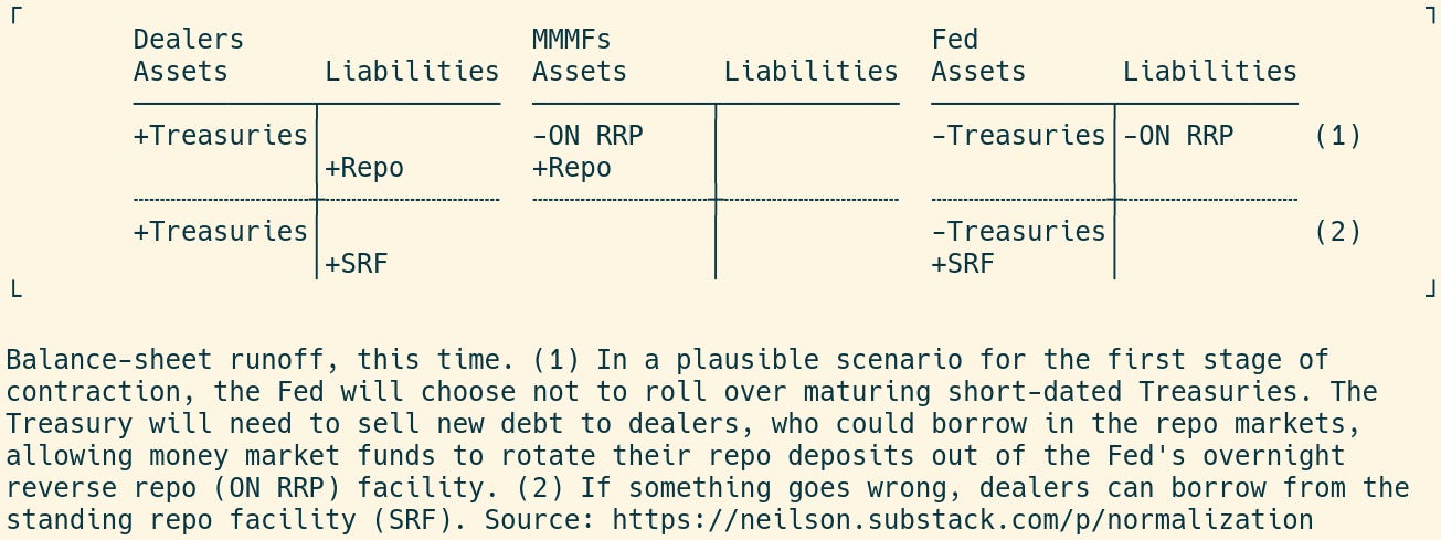 The FOMC is keen to do this without breaking money markets as in 2019. That time, the Fed had to lend into repo markets on a crisis footing. Now, differently, the Fed has at its disposal the new standing repo facility (SRF), by which dealers (and soon also banks) can borrow cash on their own initiative and without stigma. In the event that repo markets seize up, that is, banks and dealers can obtain funds directly from the Fed. This possibility is shown below the line in the T accounts above. Even if the SRF is not used, the FOMC is taking its existence as a factor supporting quicker runoff.