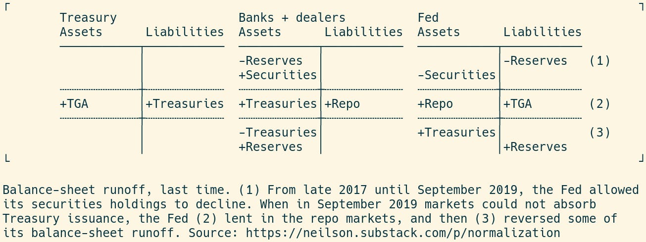 Hi, thank you for the post. I do not understand why repayment of THOSE securities destroys reserves? You write "... allowing its Treasury and mortgage-backed securities to mature. Repayment of those securities destroyed reserves. By September 2019, that process reached a breaking point in the repo markets: the Treasury's attempt to issue debt caused repo rates to spike." Is it that the issuers (banks) repay their MBS by reducing their reserves? And is it that the Treasury repay by reducing its TGA or its reserves, in a manner of speaking? Repo rates spike because T's got depleted in the repo market AND the T tried to issue more T's?