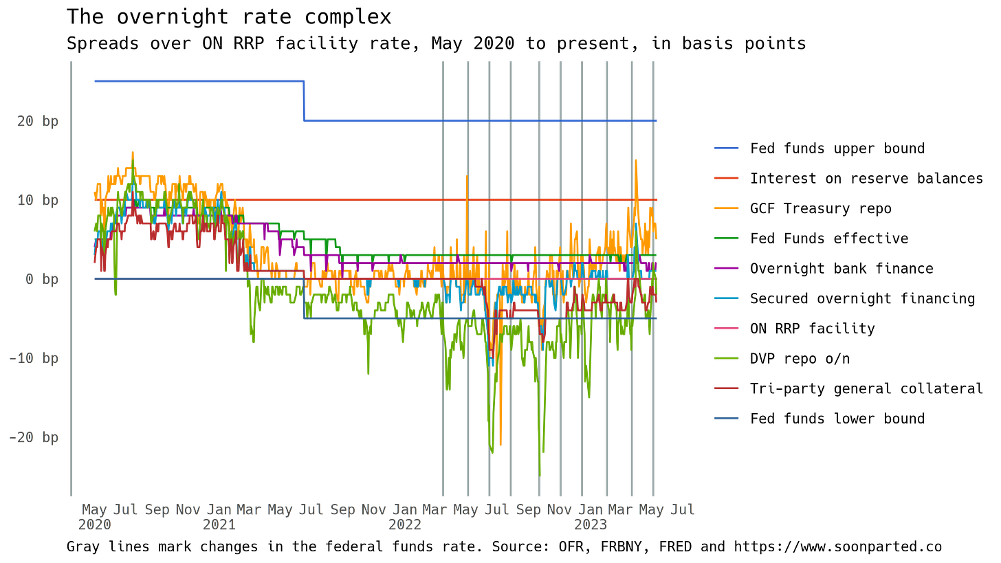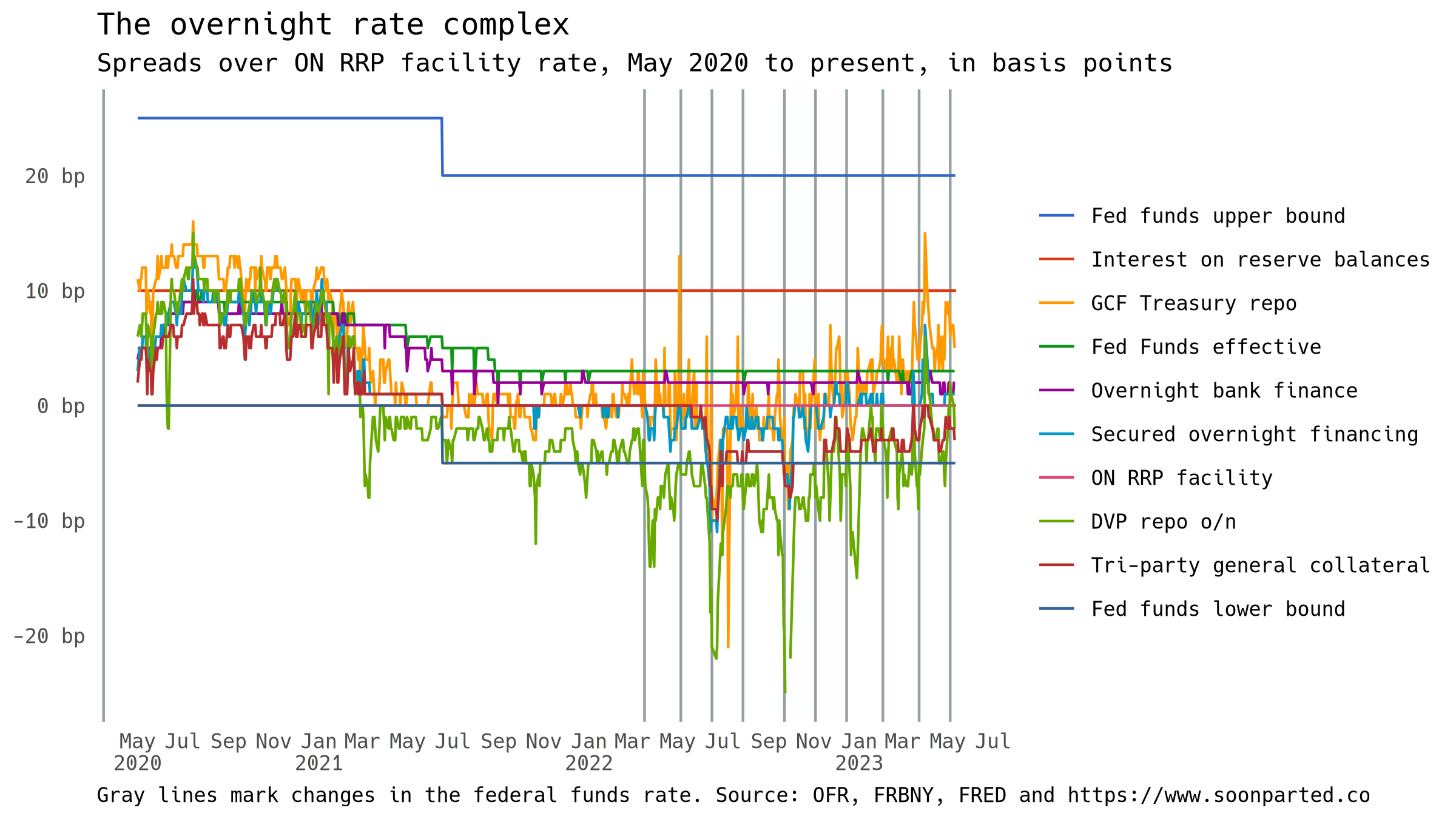 This graph shows the most important overnight dollar interest rates. Four of them—the federal funds upper and lower bounds, interest on (banks’) reserve balances, and the overnight repo deposit (ON RRP)—are administered rates (flat lines); the others are market rates. Each rate is expressed as a spread above the ON RRP rate (explained below). The rates move together, so the last year’s rate increases are mostly factored out. The message is in the overall shape, not in the details: