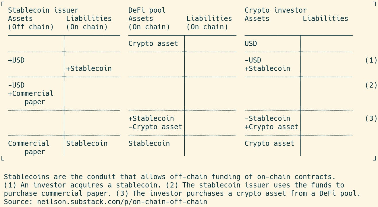 The recent growth of stablecoins has much to do with the growth of decentralized finance (or DeFi as its enthusiasts prefer). DeFi is a network of programmed smart contracts that respond to user transactions according to programmed logic, without discretionary intervention. DeFi is to banking as algorithmic trading is to stock picking, you might say. But DeFi's smart contracts exist only on blockchains, typically Ethereum. In other words: Stablecoins are the conduit that allows off-chain funding of on-chain contracts. Here is an illustration in T accounts: