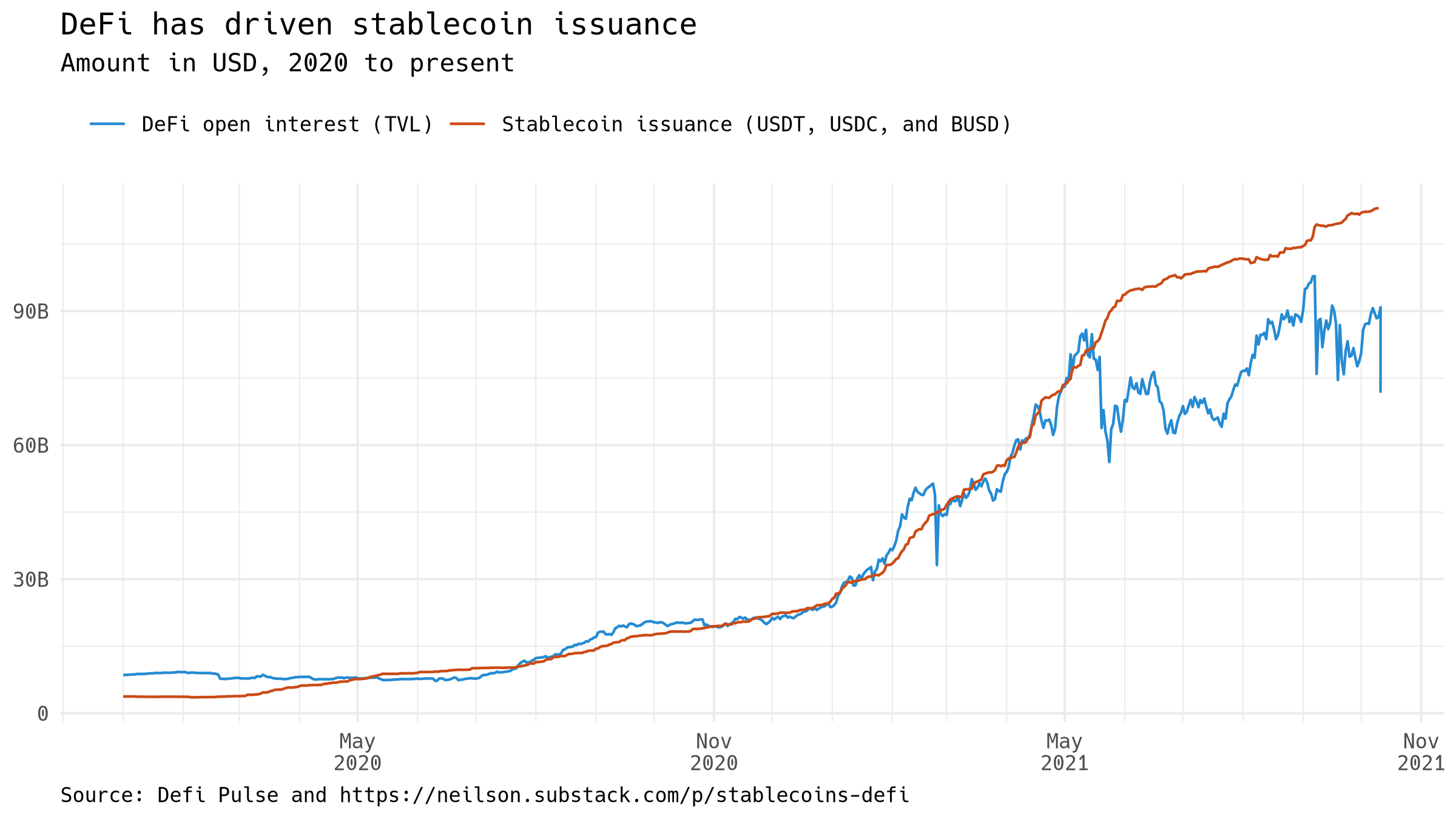 This graph shows, in red, total stablecoin issuance for the same top stablecoins as above, and in blue, the outstanding open interest in decentralized finance (DeFi) unattended contracts. The DeFi data comes from DeFi Pulse, where in keeping with the lingo it is known as "total value locked." I call it open interest by analogy to futures markets. Given the rapidly changing nature of the phenomenon, we should be cautious in drawing conclusions. Even so, it seems clear that the growth of stablecoin usage, and the growth of decentralized finance, are closely connected.