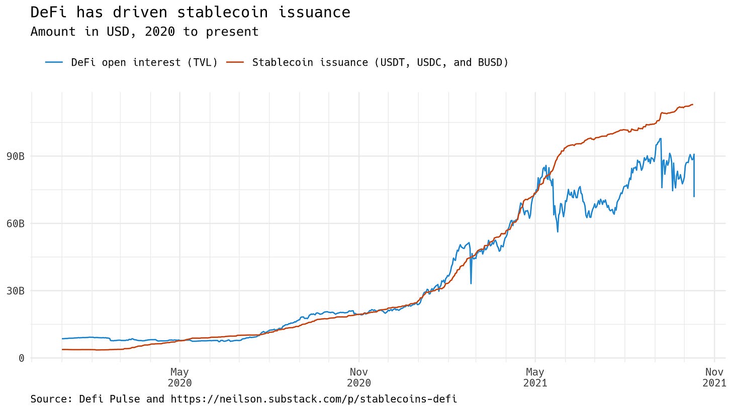 This connection is stablecoins' infrastructural function: to enable participation in DeFi unattended contracts, a speculator must first bring value on-chain. Stablecoins have become the preferred way to do that, because par clearing simplifies the analysis of transactions and the comparison of alternative investments. These considerations are familiar banking ideas. But unattended contracts (which may or may not prove to be "smart") are in many ways genuinely new. Importantly, they are what is driving the use of stablecoins.