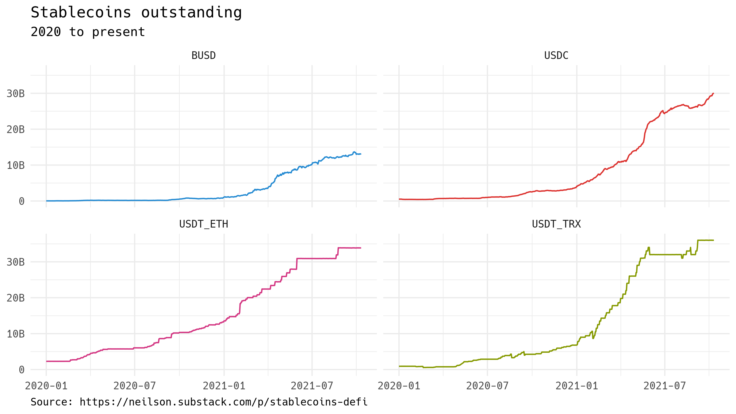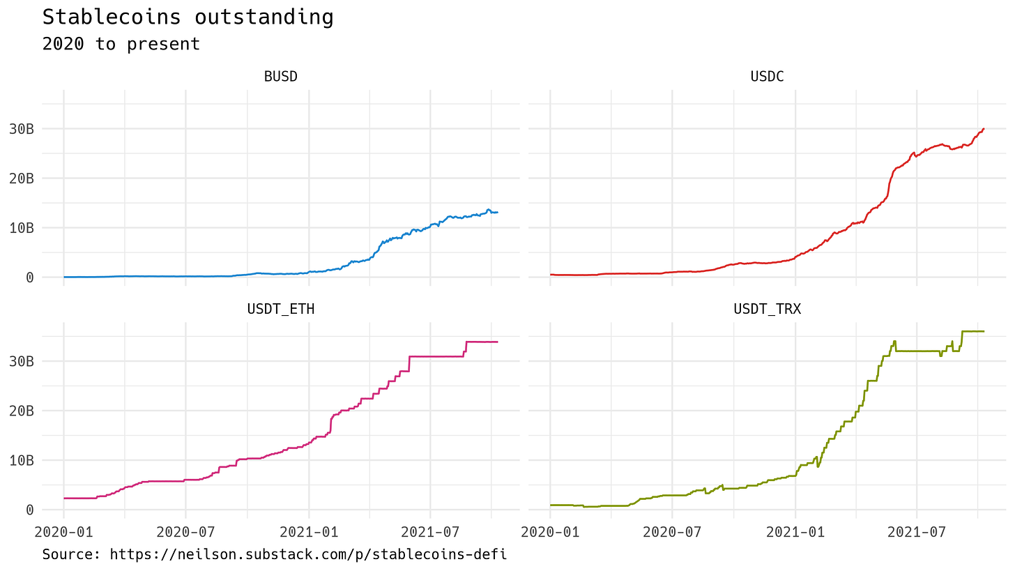 This graph shows the total outstanding issuance of the four largest stablecoins. Two of the four are issued by Tether, on the Ethereum and the Tron blockchains. USDC is jointly operated by Coinbase and Circle, on the Ethereum blockchain; BUSD by Paxos, on the Binance Smart Chain. Issuance of stablecoins has risen steeply from next to nothing at the beginning of 2020 to more than $100 billion at present.