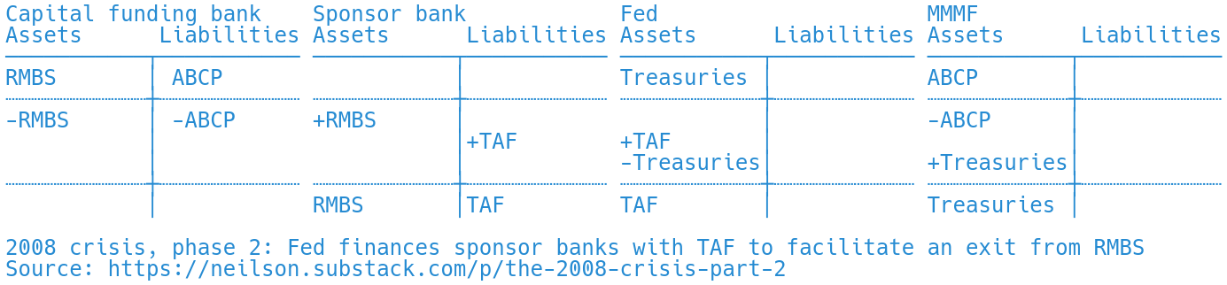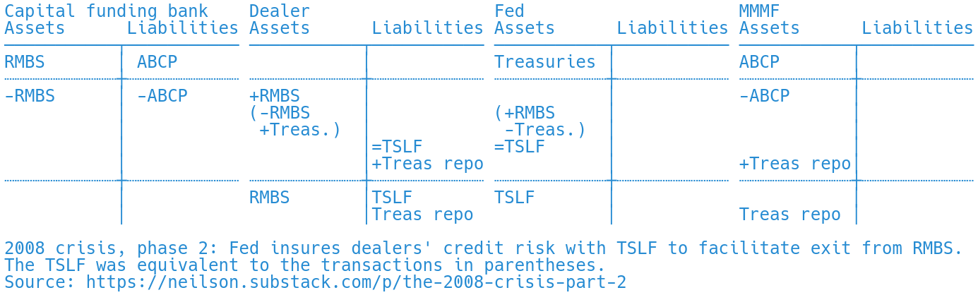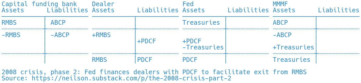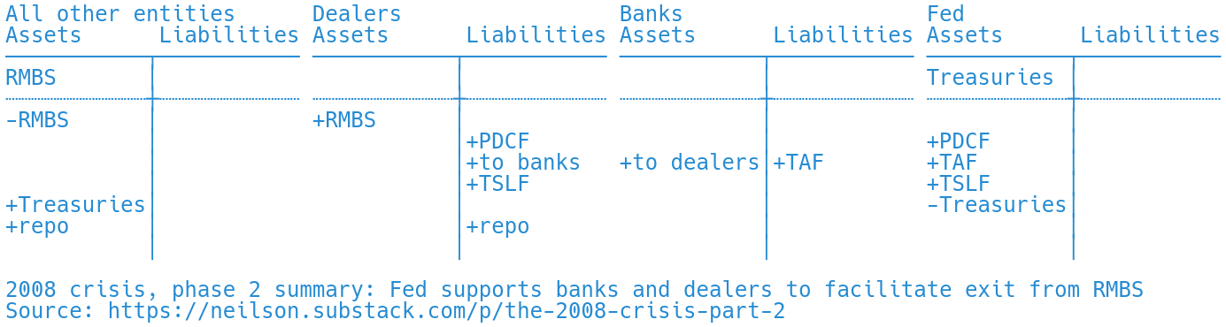 The second phase of the 2008 crisis involved considerable use, but not expansion, of the Fed’s balance sheet. The various liquidity facilities were all designed to fund the market’s exit from its RMBS position. This set of summary T accounts separates the Fed, dealers and banks. All other entities are consolidated, as a result of which the ABCP position is not shown.