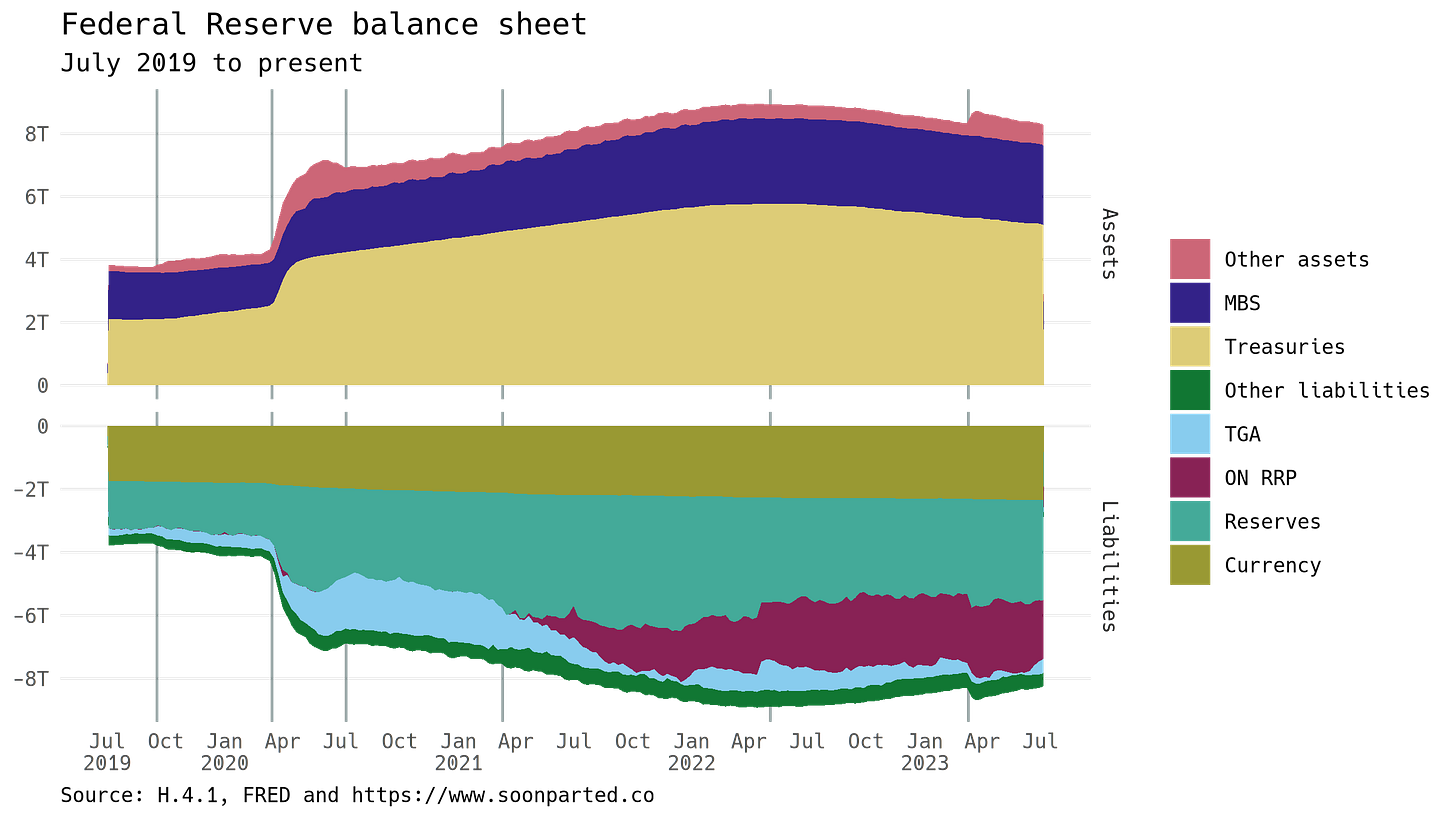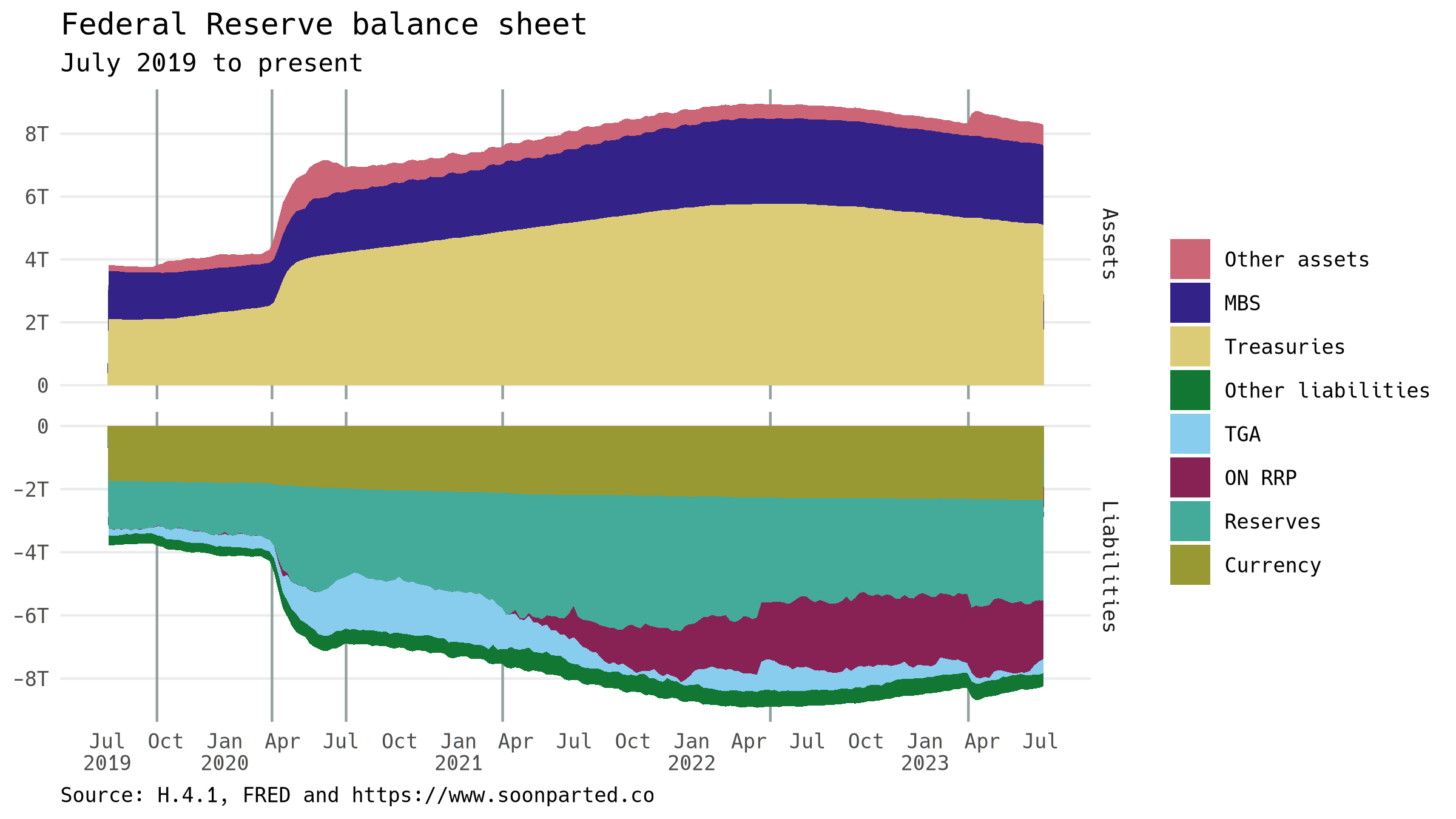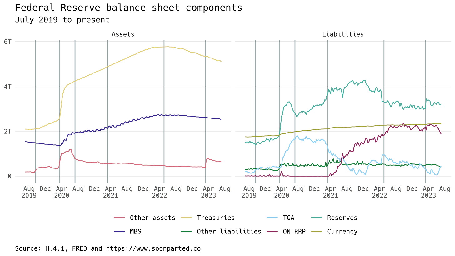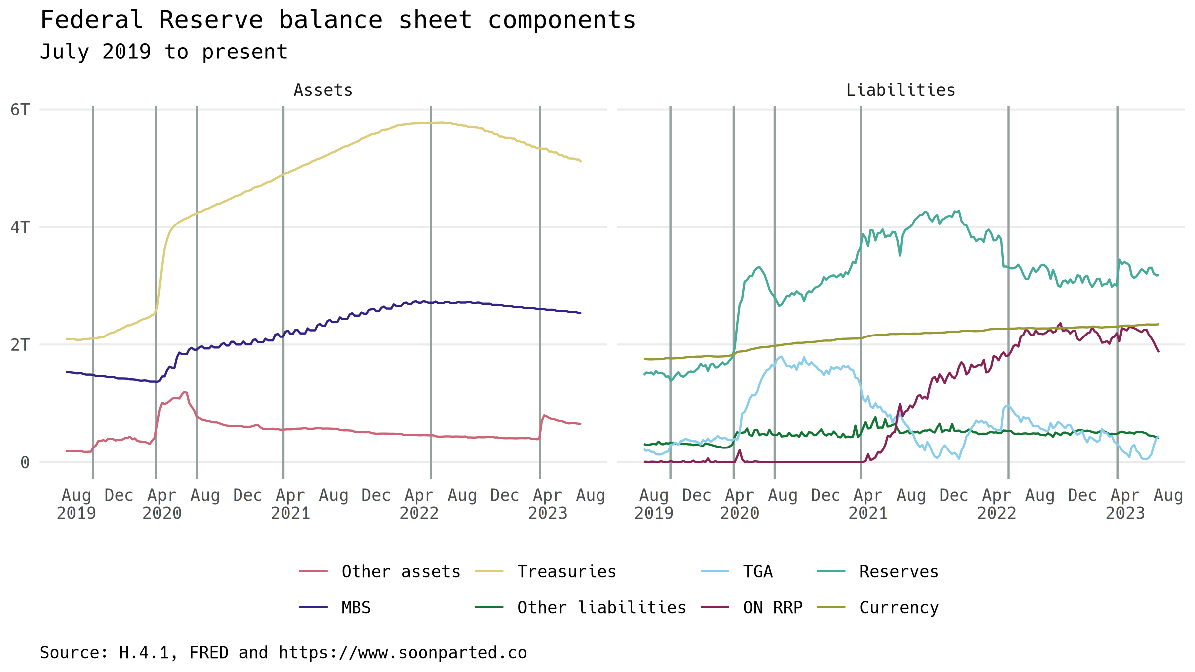 The two sides of the balance sheet always balance, so the reduction in asset holdings must be balanced by a contraction on the liability side. The graph below shows the same data above, but with each entry graphed separately, rather than stacked. Liabilities are shown in the right-hand panel. The most interesting entries are reserves, ON RRP, and the Treasury General Account, or in other words the deposits of banks, money market funds, and the US government respectively.